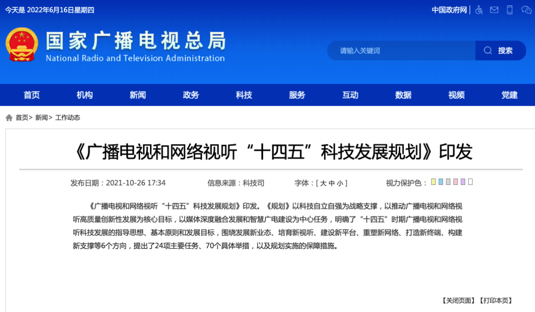 广播电视和网络视听技术标准体系不断完善。2021年10月,国务院发布《国家标准化发展纲要》,提出要加快广播电视和网络视听标准化建设、构建全媒体传播标准体系等,指明了广电行业标准化建设的方向。基于新一代信息技术融合应用,广电总局制定发布了高新视频、基于区块链的内容审核、应急广播、视音频内容分发数字ag捕鱼王的版权管理等7个标准。同时组织开展融合媒体云平台、广播电视网络安全、有线网络升级改造、5g网络视听安全传输、监测监管等5个标准体系的研究,进一步完善标准化总体布局。标准的发布发挥了重要作用,网络视听收视大数据系列标准的发布,有效规范网络视听收视数据规范接入广电总局收视大数据平台;互联网电视、iptv系列标准的发布,进一步规范了互联网电视平台对接,加强了iptv技术监管;融合媒体云平台系列标准的发布,促进了广播电视台内容融合生产;超高清系列标准的发布,加强了对超高清音视频节目制作播出的指导。2021年,广电总局共下达45项行业标准制修订任务,发布31项行业标准和技术文件,编制完成30项行业标准。tvos相关6项标准获得国标委立项批准。此外,组织编制完成超高清、数字ag捕鱼王的版权管理等3项国家标准和1项国家标准英文版。