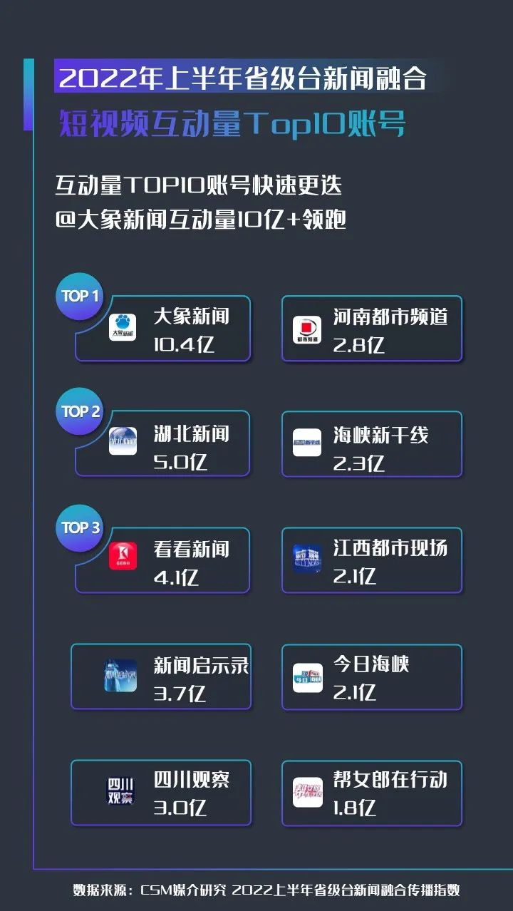 csm媒介研究监测省级台新闻账号在今日头条、腾讯新闻、抖音、快手、微信视频号等5个平台发布的内容发现,在2022年上半年连续25周的监测中,@看看新闻、@大象新闻、@四川观察、@湖北新闻4个账号每周发布的内容均进入各平台高流量内容top20,账号内容传播力占据优势;@荔枝新闻、@垄上行2个账号发布的内容,共23周进入各平台高流量top20。