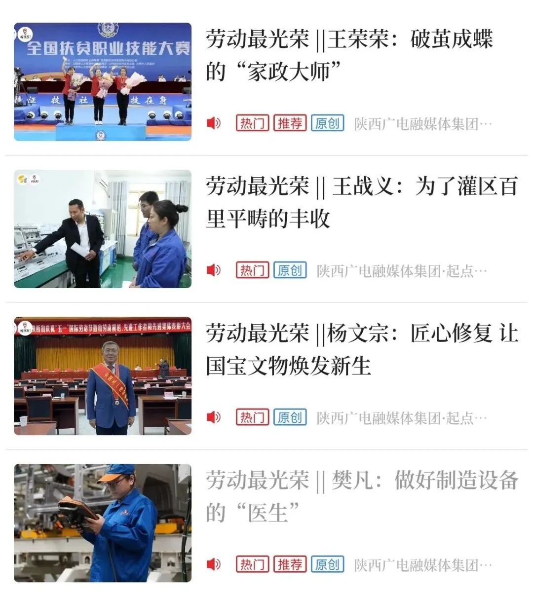 五一前夕,由陕西广电融媒体集团起点新闻客户端推出“劳动最光荣”专栏,对话我省获得2022年全国五一劳动奖和全国工人先锋号的先进集体、先进个人代表,以及省上评选的劳动模范和先进集体,倾听他们用劳动创造幸福,用技能成就梦想的感人故事……