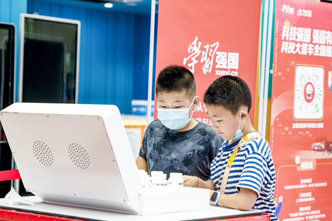 7月30日至31日,“科技强国强国有我”科技大篷车亮相西安曲江海洋极地公园,青少年们体验科技设备。