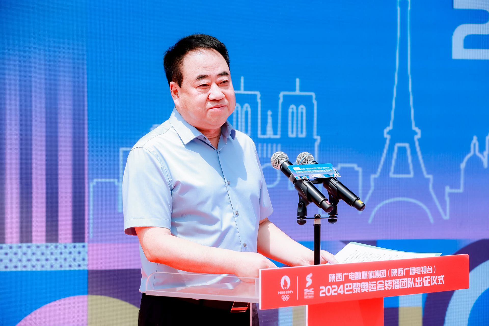 2024 年7月22日上午,陕西广电融媒体集团(台)巴黎奥运会转播团队出征仪式在陕西广电大剧院举行,22名队员整齐列队,准备踏上奥运征程,参与巴黎奥运会羽毛球项目公用信号制作。
