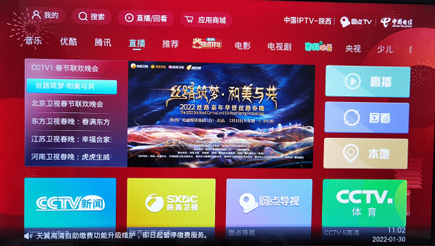 圆点tv通过直播、点播组合运营,在圆点tv重点宣推央视、陕台丝路春晚、各大卫视春晚直播,央视《2022春节联欢晚会》、陕台《丝路筑梦 和美与共》春晚、东方卫视《2022幸福合家欢》春晚等备受瞩目的春节联欢晚会,均在圆点tv 上线并宣推。