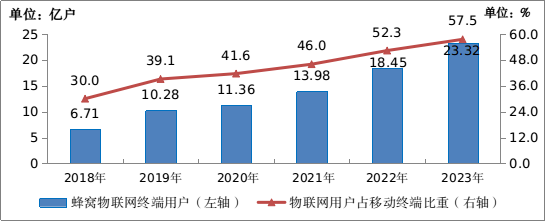 截至2023年底,三家基础电信企业发展蜂窝物联网用户23.32亿户,全年净增4.88亿户,较移动电话用户数高6.06亿户,占移动网终端连接数(包括移动电话用户和蜂窝物联网终端用户)的比重达57.5%。