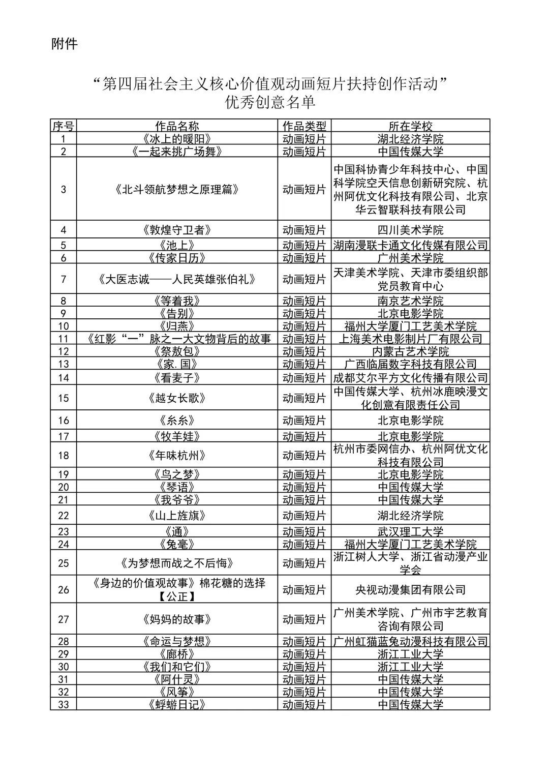 附件:“第四届社会主义核心价值观动画短片扶持创作活动”优秀创意名单