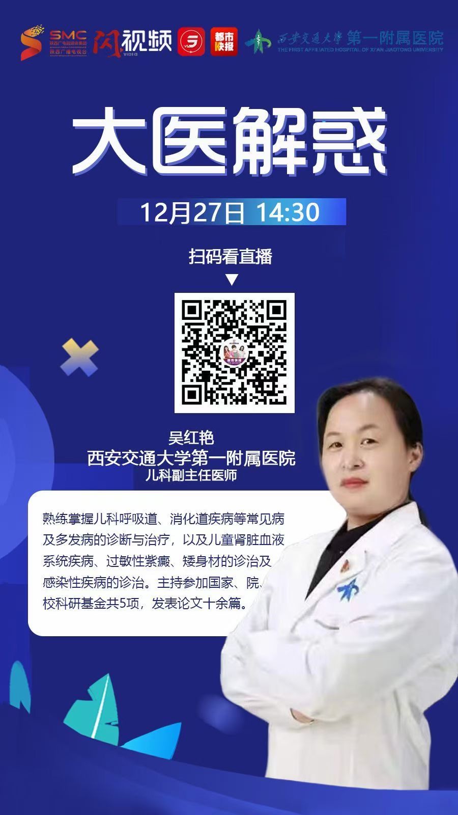 12月27日 “大医解惑”首场直播邀请西安交大一附院医学儿科副主任吴红艳走进《陕西都市快报》视频号直播间,针对儿科呼吸道、消化道等疾病进行普及。直播时长80分钟,观看量1.2万人次,点赞近1万,260余名网友在直播间进行互动,受到广大网友的关注和点赞。随后,我们还将对网友提出的各类问题进行搜集整理,联系多个领域专家进行直播,为居家群众答疑解惑,解决就医难题。